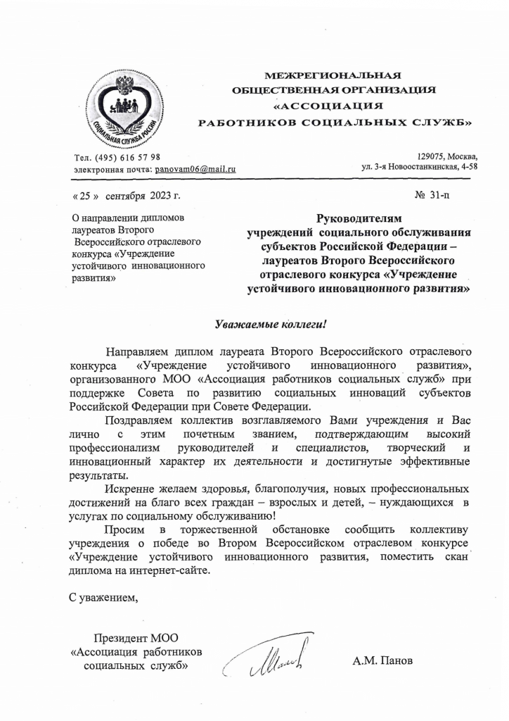 «Поздравляем коллектив возглавляемого Вами учреждения и Вас лично с этим почетным званием, подтверждающим высокий профессионализм руководителей и специалистов, творческий и инновационный характер их деятельности и достигнутые эффективные результаты», — отметил представитель организаторов, президент Ассоциации работников социальных служб Андрей Панов.